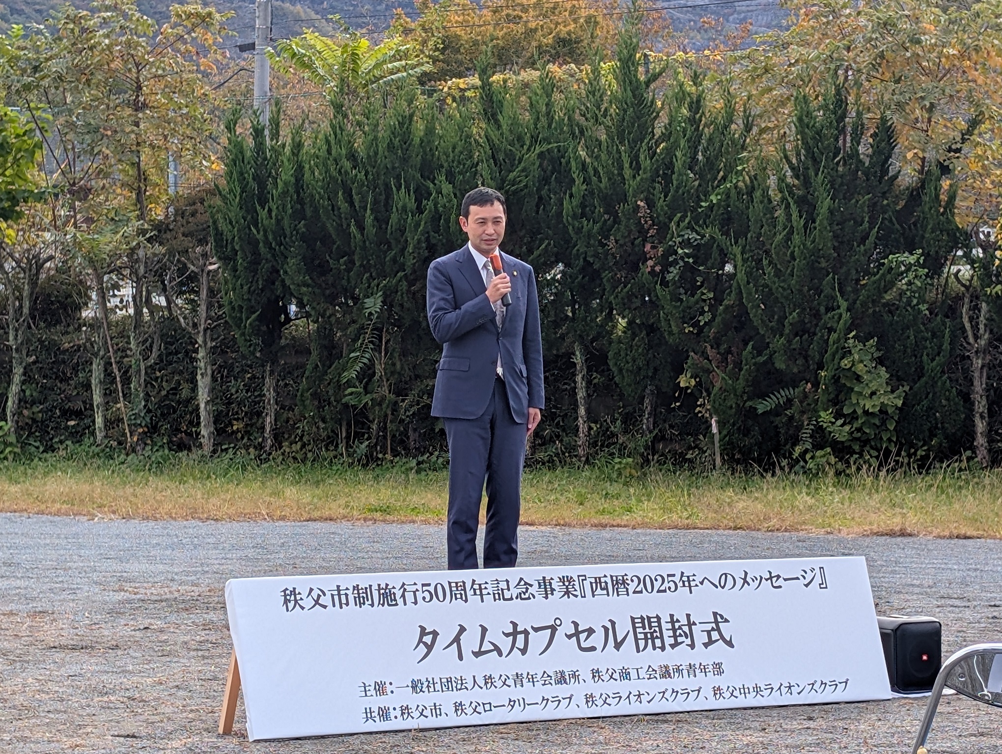 先日、羊山公園で秩父青年会議所と共催したタイムカプセル開封式(秩父市誕生20周年記念冠事業)に出席しました。タイムカプセルには未来へ託された手紙が多数入っており、その中には当時の秩父市長・内田全一氏から2025年の秩父市長へ宛てた手紙がありました。そこには「伝統の温かみと新鮮な感動を咲かすまち」という秩父市の将来像が力強く掲げられていました。道の駅の設置や市町村合併といった課題への強い意欲も記されており、時を越えて紡がれる志の重みを深く感じました。