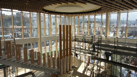 またまた、久々の更新となってしまい申し訳ありません。 工事は秋から冬にかけ、順調に進み、建物本体は完成に近い形となりました! 秩父夜祭後は、周囲の囲いが外され、全体がよく見えるようになりました。 これは南側からの建物全景です。建物周辺では、外構工事が行われています。 これは秩父公園側から見た建物です。囲いがなくなりすっきりしました。 ただし、危険ですので、完成まで絶対に現場内へ立ち入らないようお願いします。 つづいて、室内です。ここは新本庁舎のエントランスホールです。 吹き抜けとなっており、明るく、開放的な空間となっています。 こちらは新本庁舎1階南側カウンターの様子です。 市民課など、市民の皆さんがよく訪れる課が入る予定です。 こちらも南窓に面し、明るい空間となっています。 こちらは西側カウンターの様子です。 福祉部門の課が入る予定となっています。 写真には写っていませんが、右側には光庭と呼ばれる中庭があり、外部の光を積極的に取り入れる計画となっています。 工事現場見学会の際、ポテくまくんが登場したのが、まさにこの場所です! こちらは新本庁舎4階市議会本会議場となります。 議席などの家具も設置されました。 壁や天井には、市有林産木材を積極的に活用しています。 こちらは新本庁舎3階エレベーターホールです。 各階のエレベーター扉の色は合併した旧4市町村のイメージカラーを採用しています。ちなみに3階は旧大滝村のイメージです。 こちらは、市民会館大ホールの2階席です。 ビニールに包まれていますが、既に座席が設置され始めています。 こちらは2階席から舞台を見下ろしたところです。 舞台では、現在、床の施工をしています。 市有林産材の桧無垢材を使用した、まさに「桧舞台」です! こちらは、市民会館のエントランスホールです。 こちらも庁舎同様、吹き抜けとなっています。 中央に見える4本の柱は、これも市有林産材である杉の磨き丸太です。 こちらは2階、けやきフォーラムです。 こちらも、天井や壁に木材を活用し、温かみのある空間となっています。 再び外に出て、こちらは新本庁舎西側の様子です。 歴史文化伝承館と2階で繋がる連絡通路が見えます。 これで、両施設の行き来がとても便利になります。 最後に、南側からみた歴史文化伝承館(写真左側)と新施設です。 2年前に着工し、いろいろなことがありましたが、無事、ここまでできました! 今後は、外構工事を中心に工事が進みますが、最後まで、無事故で完了するよう、施工者一丸となり、総仕上げに取り組んでいきます! 約2年間に渡りお伝えしてきた「建設工事の状況」ですが、建設工事が完成間近となりましたので、今回で最終回としたいと思います。 途中、なかなか更新できない時期もあり申し訳ありませんでした。今後は、新施設の利用開始に向け、さまざまな準備を進めていきたいと思います。 それでは、目前に迫った、新市民会館、新本庁舎の完成をご期待いただくとともに、これからも建設工事について、ご理解、ご協力賜りますよう、よろしくお願い申し上げます。ありがとうございました。