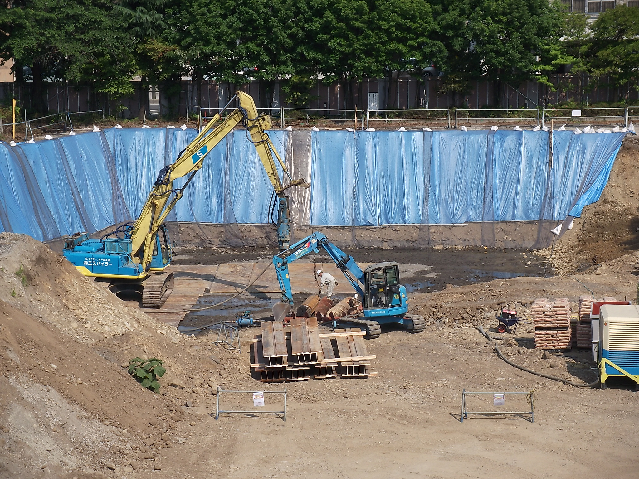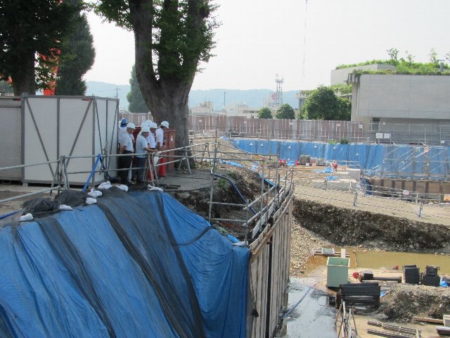 5月から引き続き山留工事を行っています。鉄骨杭を打ち、杭の間に矢板を入れています。 山留の完成です。 庁舎棟南側部分のラップルコンクリートです。ラップルコンクリートとは基礎下の地盤改良法の一つです。基礎が立つ部分を堅固な支持地盤まで掘り下げ、コンクリート補強していく工法です。