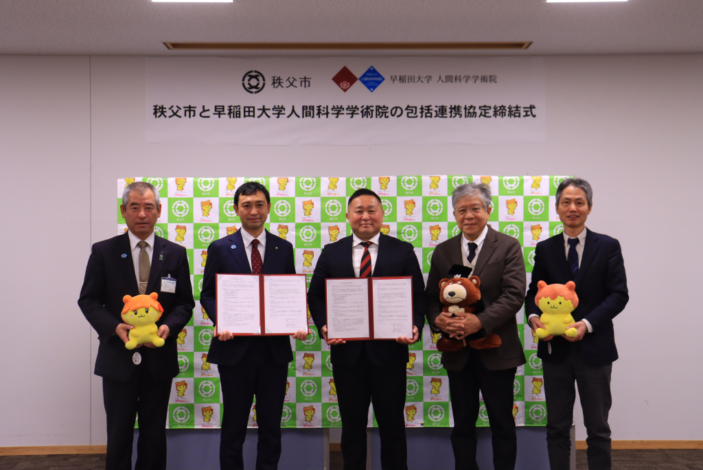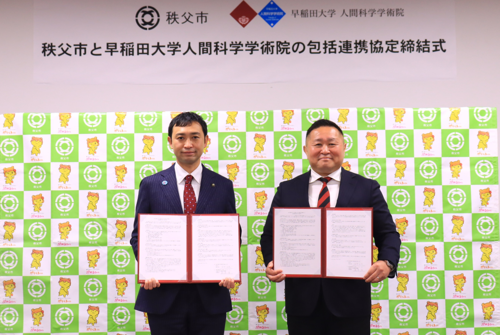 秩父市と早稲田大学人間科学学術院は包括連携協定を締結しました。協定は、地域コミュニティの発展、社会福祉の充実・健康増進、環境保全と創出、観光・産業振興、教育・文化の振興、人材育成など、多岐にわたる分野での連携・協力を定めるものです。秩父市を研究・実証のフィールドとして活用いただくことで、大学側は地域課題の把握・解決、秩父市においては地域活性化など、連携により大学と行政の双方のニーズを充足させ、市民サービスのさらなる向上を目指してまいります。