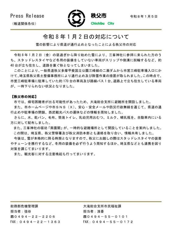 今後は本格的な積雪期を迎えますので、秩父へお越しの際はスタッドレスタイヤの装着やチェーンの携行など、必ず冬用装備を行うよう周知徹底してまいります。また、埼玉県など関係機関と連携し、観光客への注意喚起や対策を強化していきます。対応にあたってくださった職員や関係者の皆さまに深く感謝申し上げます。