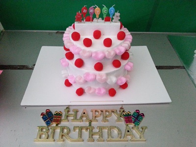 みんな集まったところで、会場の人たちに「ハッピーバースデイ」を歌ってもらったんだ♪そのあとは、いろんな人からケーキやプレゼントをもらっちゃった!
