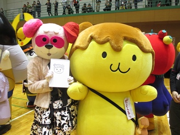 お、みんな集まってきたね。今回は約70体のキャラクターが参加してるんだってさ。みんなでパチリ。「いなりん」や「しまねっこ」もいるね。