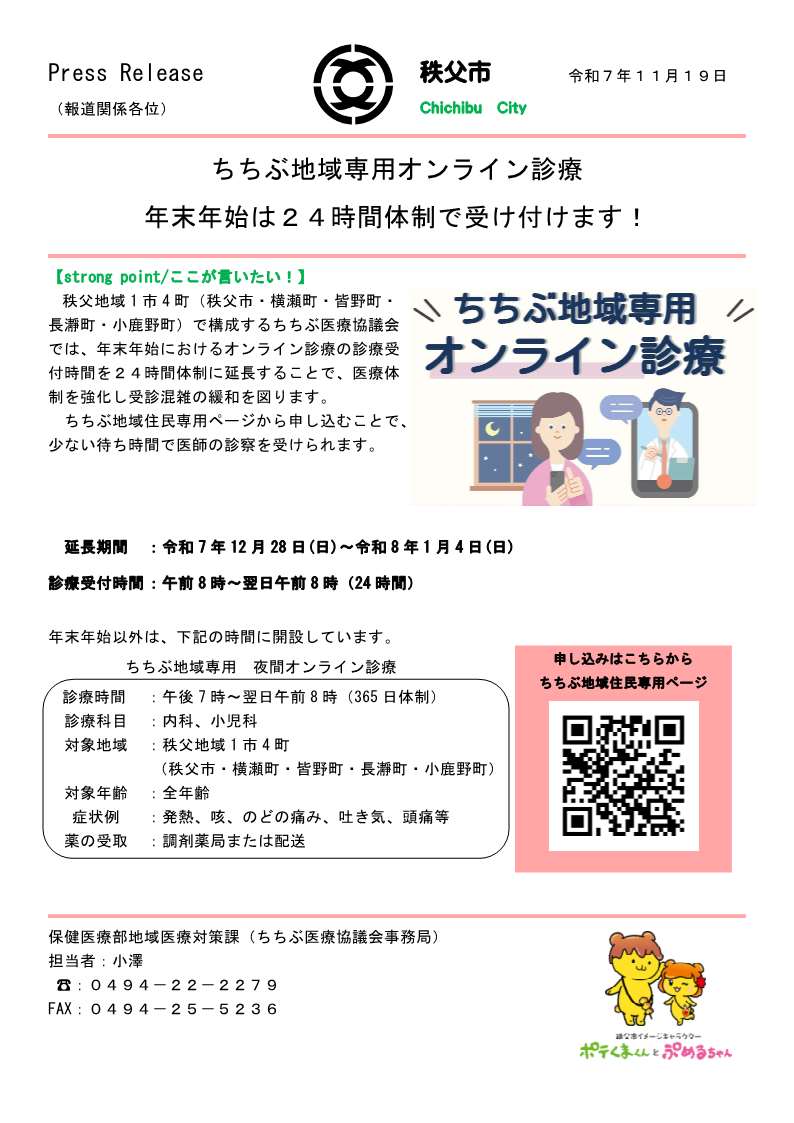 秩父地域1市4町では、「夜間オンライン診療窓口」を令和7年7月1日から開設しております。令和7年12月28日(日)から令和8年1月4日(日)までの年末年始期間中は、夜間に限らず、24時間体制で診療受付を行うことにいたしました。