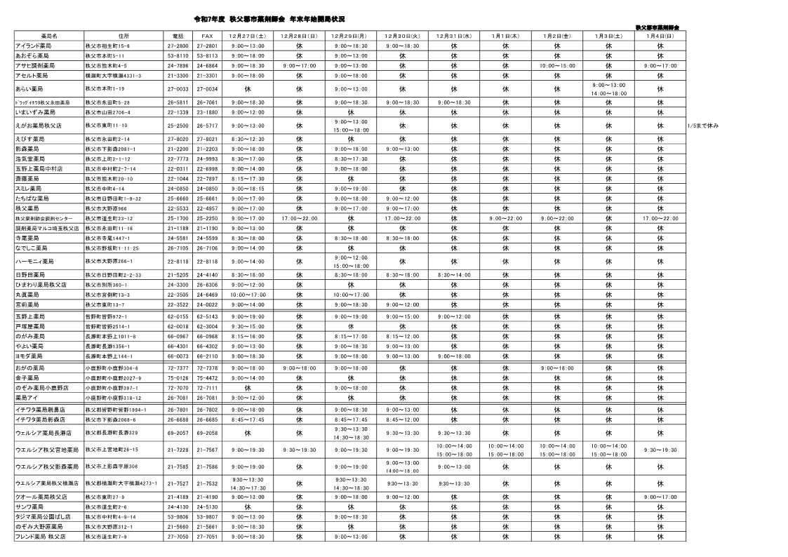 <令和7年度秩父郡市薬剤師会 年末年始開局状況>