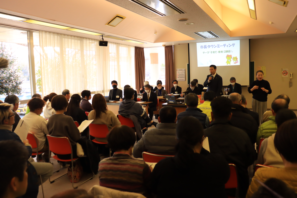 1月31日(土)に、やまなみ会館において市長タウンミーティングを「子育て・教育」をテーマに開催いたしました。60名を超える皆さまにご参加をいただき、ありがとうございました。市長就任以来、毎月開催しているこのタウンミーティングは、市民の皆さまから率直なご意見を直接伺う貴重な機会であり、私自身も楽しみにしております。後日、動画配信も予定しています。